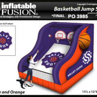 The Jump Shot Basketball game is fast pace two player basketball free throw game. This game comes with 3D basketballs on the sides. It has two regulation sized backboards. Also included are 9” mini sized basketballs so everyone can play. This game can be ordered in your colors and branded to meet your needs. The custom inflatable Jump Shot basketball game is a quick pace, double backboard shootout. This inflatable basketball game comes with an easy return ramp that can be branded too. We have designed this game with an internal blower for a sleek look. The game also comes with 9” mini basketballs so everyone can play. Dimensions 15’L x 12’W x 13’H